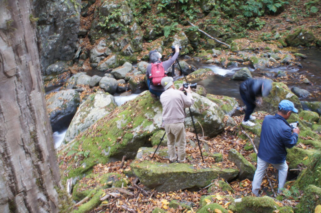 写真は、氷ノ山から流れてきた清流が段差に削られた岩肌を水しぶきを飛ばしながら流れ落ちる動きと景観をどのように取り込むかカメラの機能を駆使してアングルを決めている講座生の皆さんの様子です。