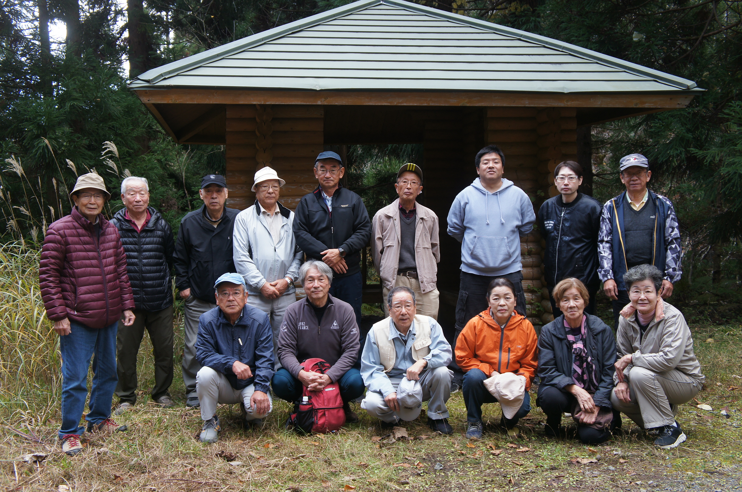 関ノ宮ルートと横行ルートの合流に東屋があります。ここで弁当を広げて昼食にしました。昼食のあと参加者が集合して記念写真に収まりました。