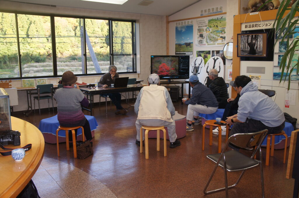 交通手段は、町内の参加者はマイクロバスに乗車で現地へ。町外の方は途中の大屋ホールで待ち合わせで合流しました。帰りは町外の方とは現地解散してマイクロバスに乗車の参加者で一路八田コミセンに帰り、いつものように参加者が撮影された写真をみんなで鑑賞しながら猪坂先生から色々なアドバイスを受けて各自の撮影技術向上に生かしました。