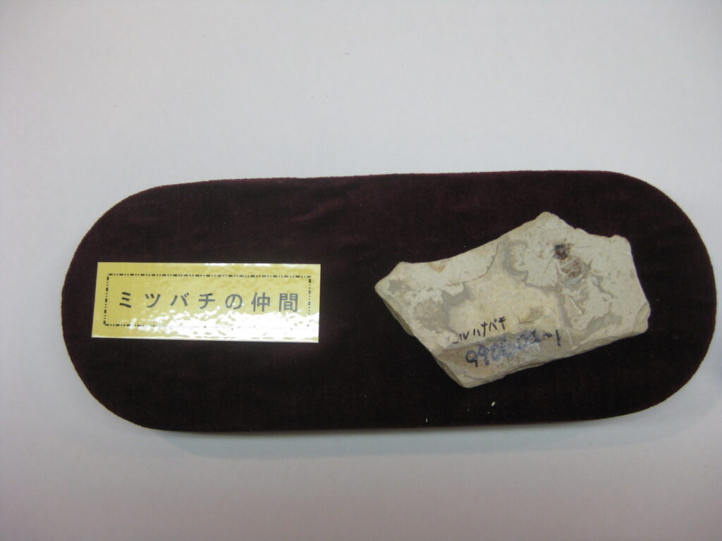 鮮新世は、約500万年前から約258年前までの新生代新第三紀の最後の時代という説明ですが、想像を絶するはるかな大昔で、主な特徴は哺乳類が進化(馬、ゾウ、サイ)大型化し、ヒマラヤ山脈の隆起が進み、天候は冷涼化して四季がはっきりするようになったと示されています。最初の類人猿が誕生した時代とも記されています。下記の写真は、おもしろ昆虫館に展示されている今回新種発表された「ミツバチ」の化石写真です。形がはっきりしていてハチと認識できます。このハチが250年前に生存していたと想像すると地球には解明できない不思議な謎に包まれた真実が今回の新種発表でゆっくりですが解明されて行くと思うと海上化石にはもっとたくさんのヒミツが隠れていると感じます。
