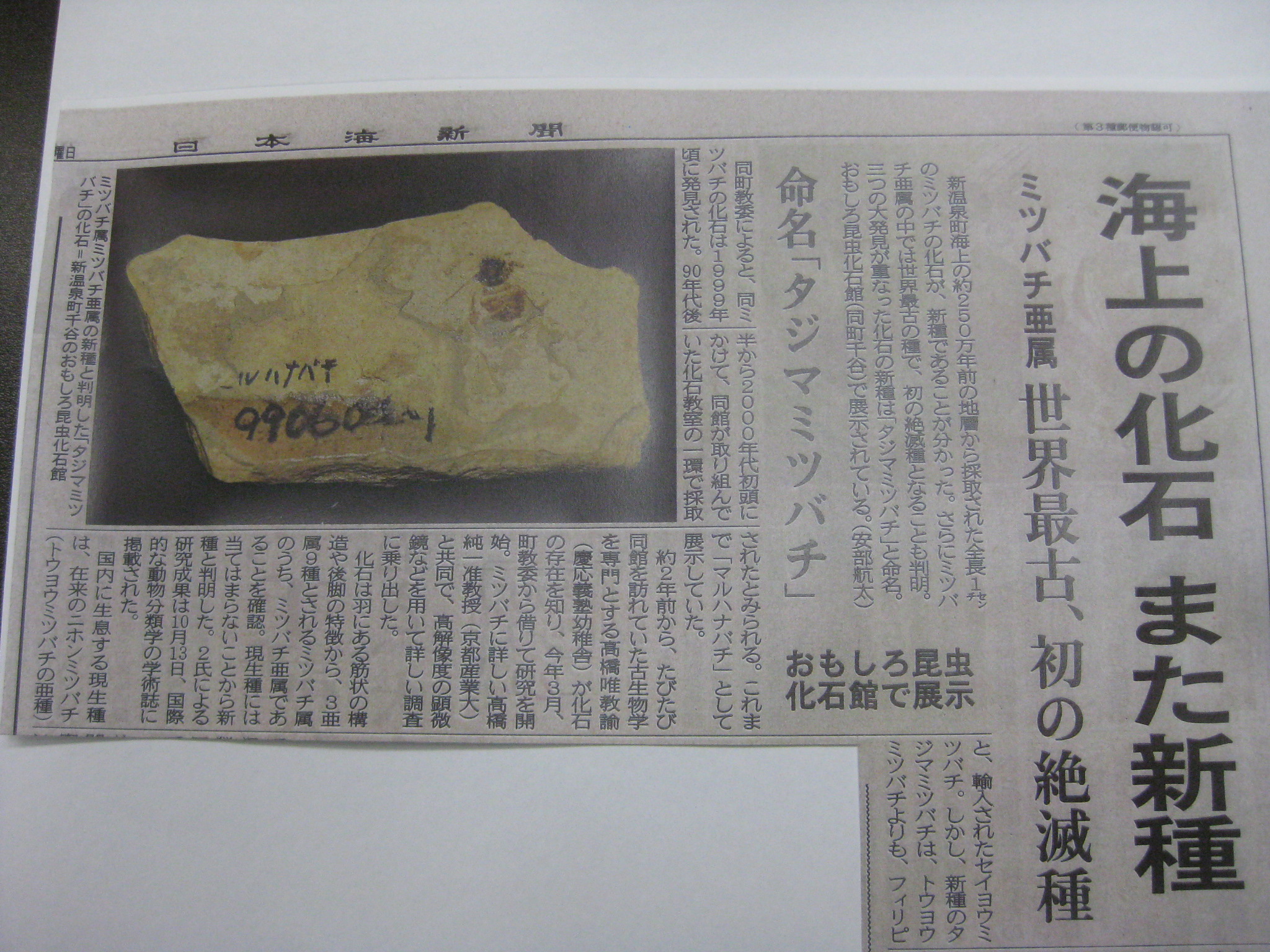 令和7年11月18日付けの日本海新聞に「海上の化石 また新種」というタイトルでおもしろ昆虫化石館に所蔵の昆虫化石の中で新たに「ミツバチの化石」が第二弾として新種発表されました。