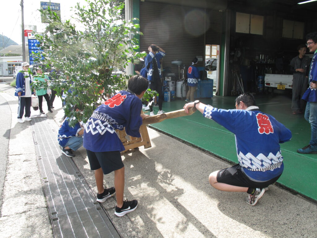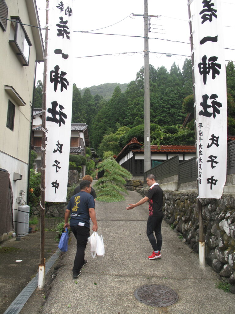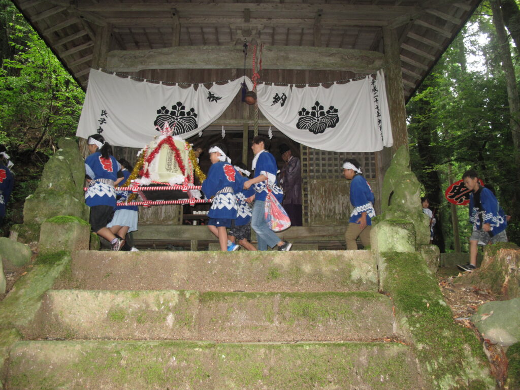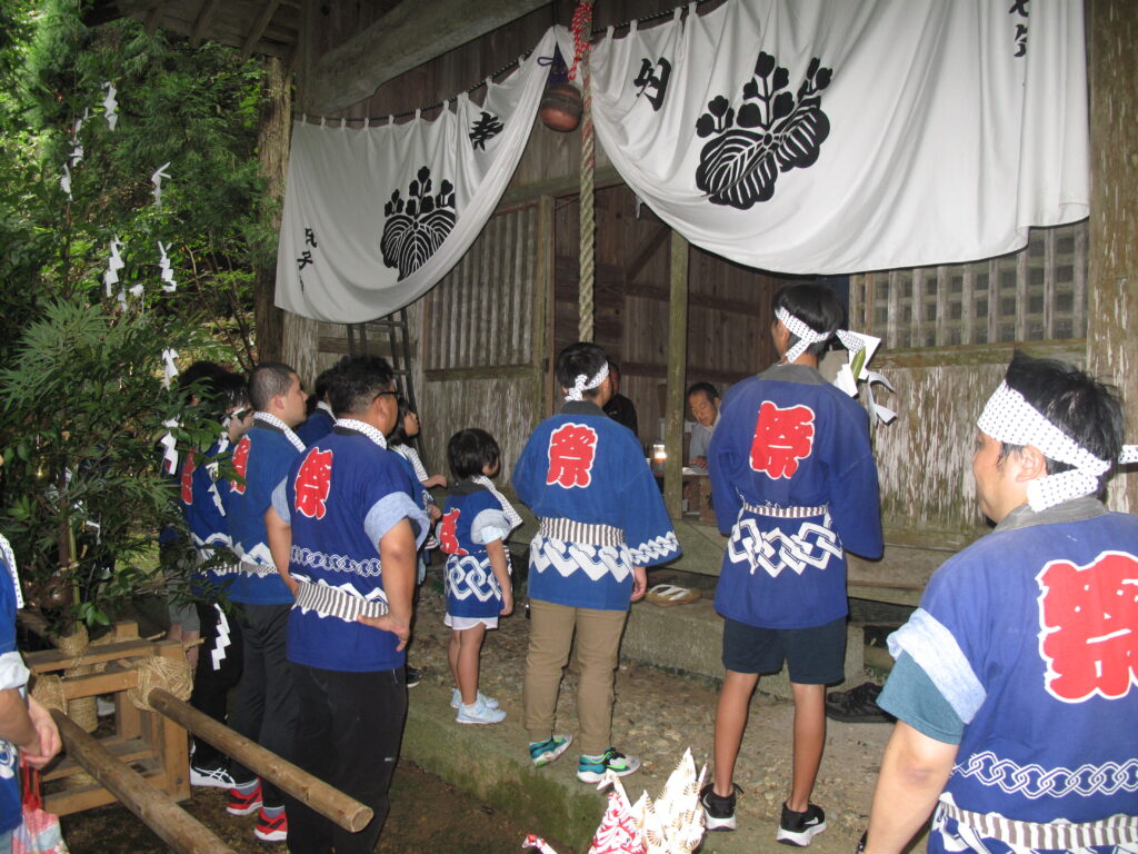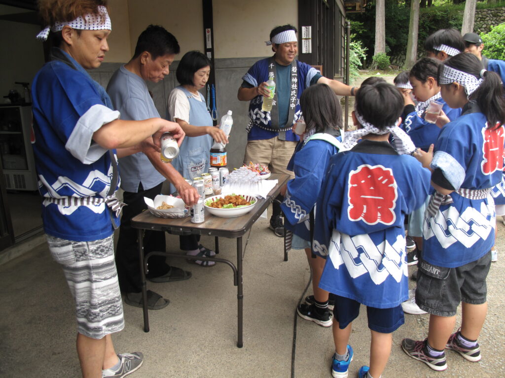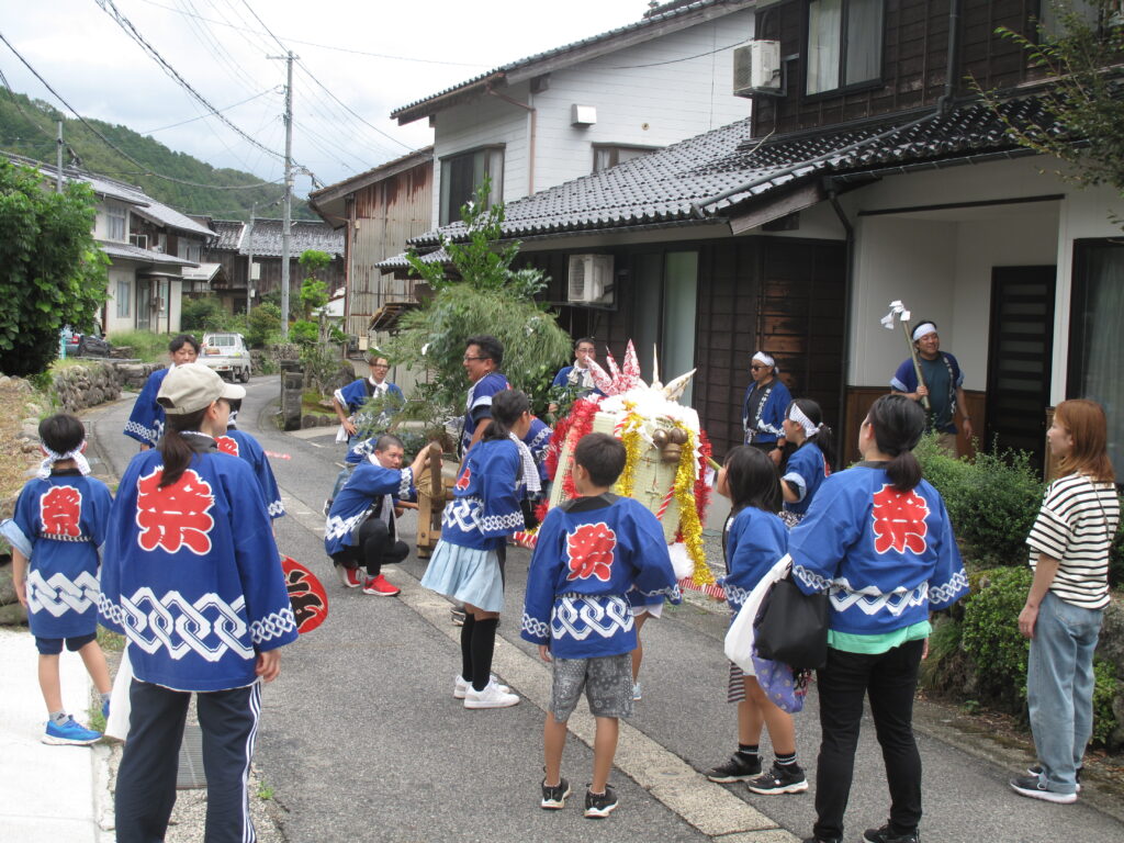 9月19日は八田統一まつり 八田地区の多くの集落で秋祭りが行われました。今年は「千原若一神社」の秋祭りを取材しました。早朝から準備やお詣りのために人が集まり始め、午前8時ごろから美方郡香美町小代区の多他神社(オオタジンジャ)からお招きした神主さんによる神事がありました。神事の後は雨上がりの青空の下、地区の青年会「若一会」による恒例の「榊神輿」に加え、今年は地区の子どもたちの希望によって大きな酒樽でこしらえた「子ども神輿」も集落内を隅々まで練り歩きました。また、多くの家々では飲物やお菓子などを用意して神輿を待つなどの接待がありました。