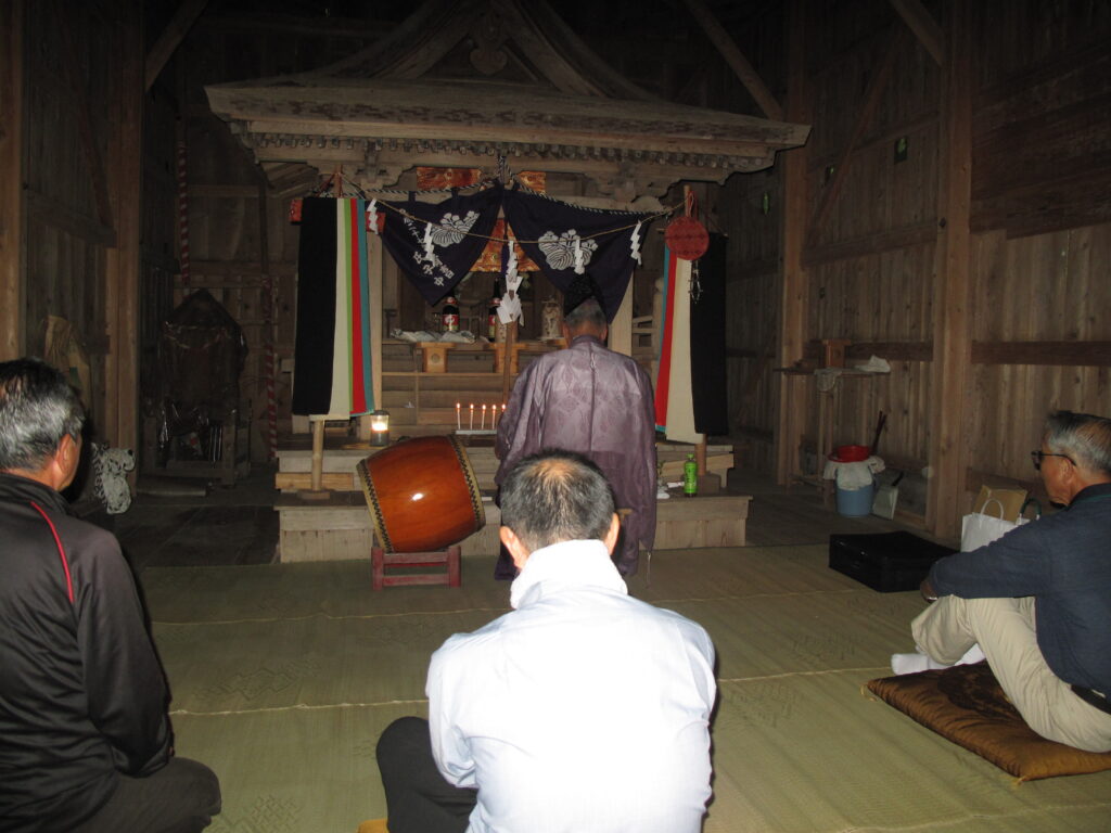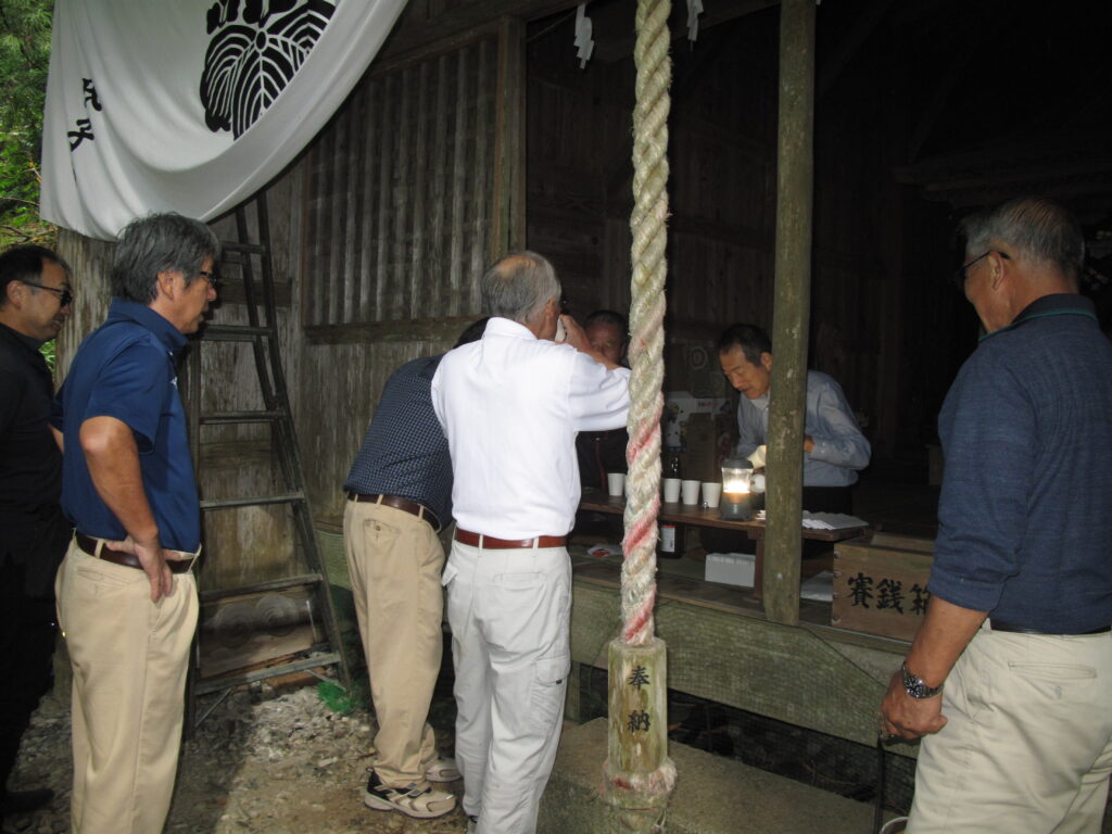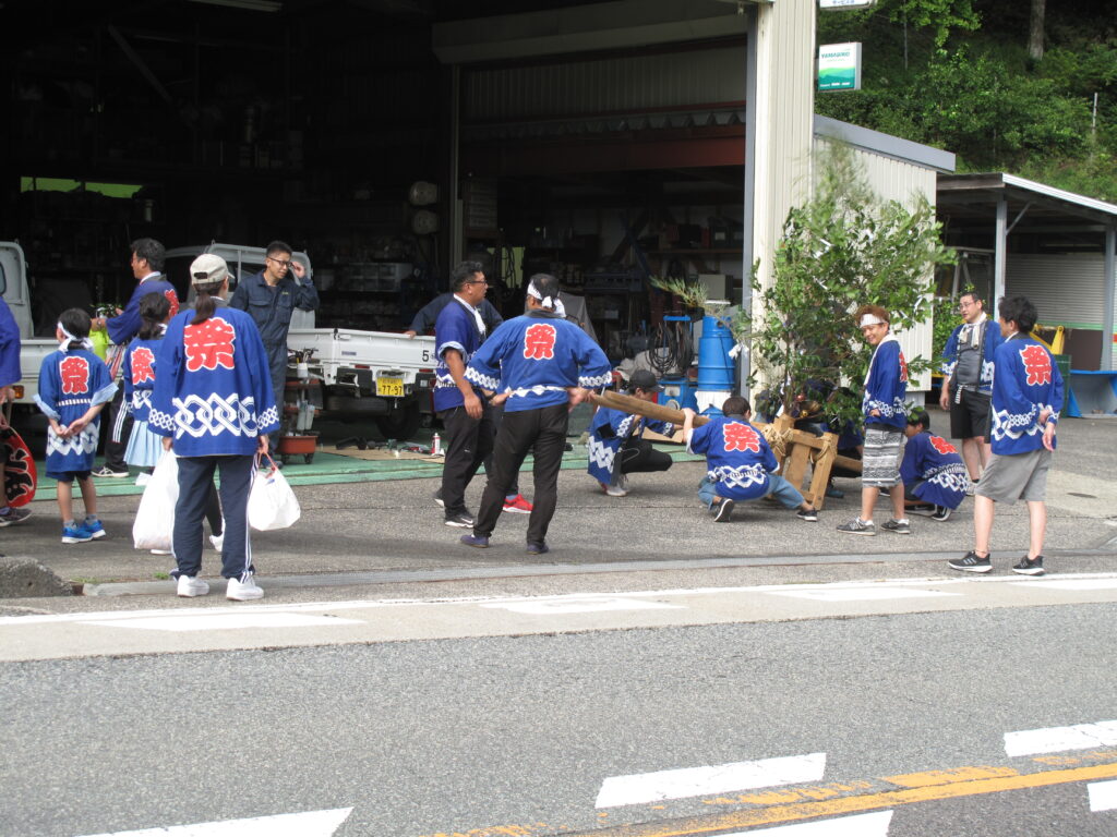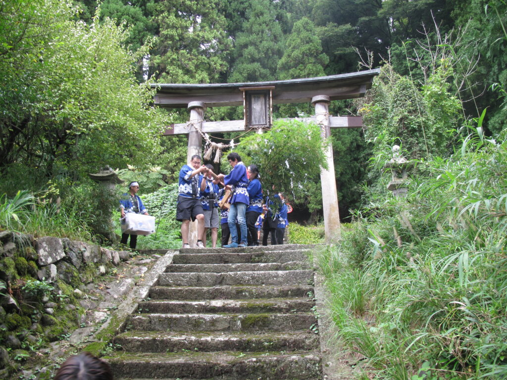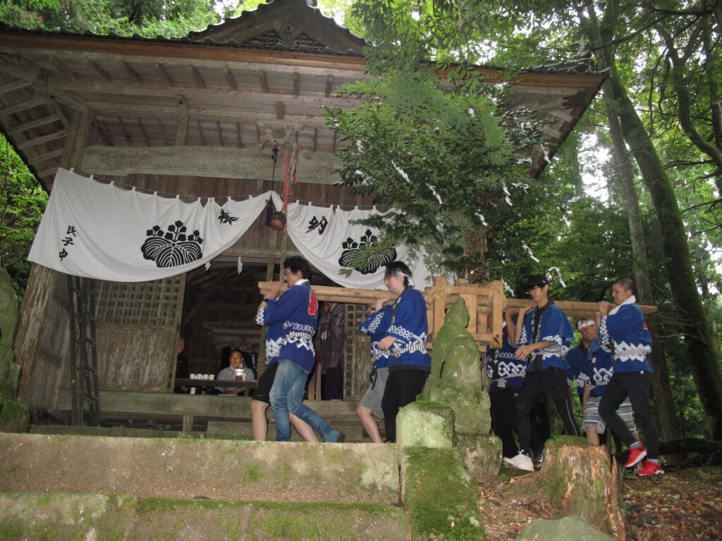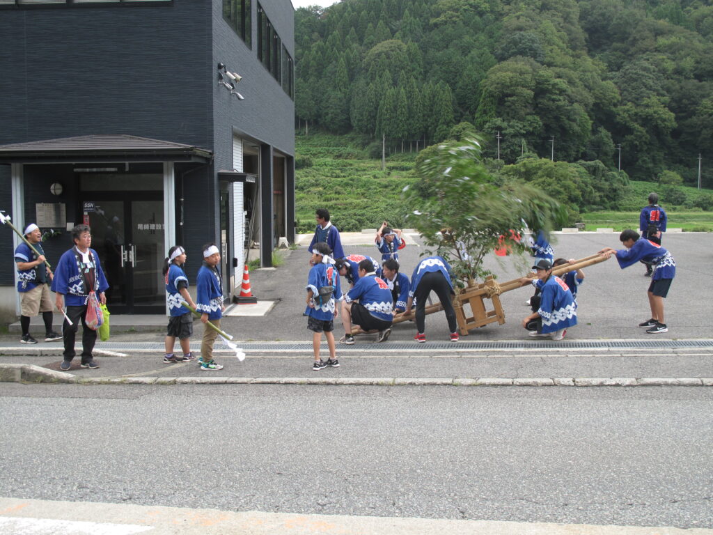 9月19日は八田統一まつり 八田地区の多くの集落で秋祭りが行われました。今年は「千原若一神社」の秋祭りを取材しました。早朝から準備やお詣りのために人が集まり始め、午前8時ごろから美方郡香美町小代区の多他神社(オオタジンジャ)からお招きした神主さんによる神事がありました。神事の後は雨上がりの青空の下、地区の青年会「若一会」による恒例の「榊神輿」に加え、今年は地区の子どもたちの希望によって大きな酒樽でこしらえた「子ども神輿」も集落内を隅々まで練り歩きました。また、多くの家々では飲物やお菓子などを用意して神輿を待つなどの接待がありました。